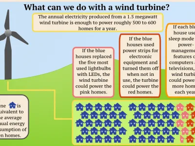 One of our roles at CUB is to help Minnesotans better understand their energy options. To do that, we also want to help people understand some of the basic, technical aspects of energy, such as measuring it. In most of our homes, energy as a resource is something we can’t see, feel, hear, or touch. We just flip a switch, and a light turns on. On top of that, the unit of measurement for energy, a kilowatt-hour (kWh) can be hard to understand. Instead of thinking about energy use and production in kilowatt-hours, it can be helpful to think about kilowatt-hours in terms of day-to-day life. This blog post will look at what certain amounts of energy mean in terms of use by the average consumer. Let’s start with the production of energy from a single wind turbine. Many wind turbines in Minnesota have the capacity of 1.5 megawatts (MW). That means that turbine will produce 1.5 megawatt-hours of electricity (or 1500 kWh) when it runs at full speed for one hour. A wind turbine with that capacity will produce roughly 5,000,000 kilowatt-hours (kWh) in a year. The average Minnesota home uses 764 kWh each month, so this amount of energy can power about 550 homes for a year. If we look at one appliance, that same amount of energy would be enough to power an average size fridge for up 10,000 years. This sure is a lot of energy for one single wind turbine, but how do smaller amounts of energy translate to day to day life? To break it down, let’s look at how long certain amounts of energy could power the average home. It takes one thousand watt-hours to add up to a single kilowatt-hour, and one thousand kilowatt-hours to add up to one megawatt-hour. When compared to the large production of a wind turbine, one watt-hour can seem minuscule. However, in day-to-day life, this amount of energy can still help run the house. For example, what can we do with eight watt-hours? With 8 watt-hours, we can power one 8-watt LED light for one hour. Eight watt-hours is just .08 of a kilowatt-hour, but this amount of energy can go a long way when coupled with energy efficient practices in the home. The info graphic below, based on a report from the U.S. Department of Energy, shows us the importance of coupling big generation with small household energy-saving practices. As illustrated, seemingly small choices, like which light bulb to use, add up. Switching the five most used light fixtures in the home to LED light bulbs saves the average family nine percent on their electricity bill per year. With nine percent more energy from all 500 homes, a wind turbine can power up to forty-five more homes in a neighborhood. When we couple energy-saving practices with clean energy, we can stretch the use of that clean energy a long way.